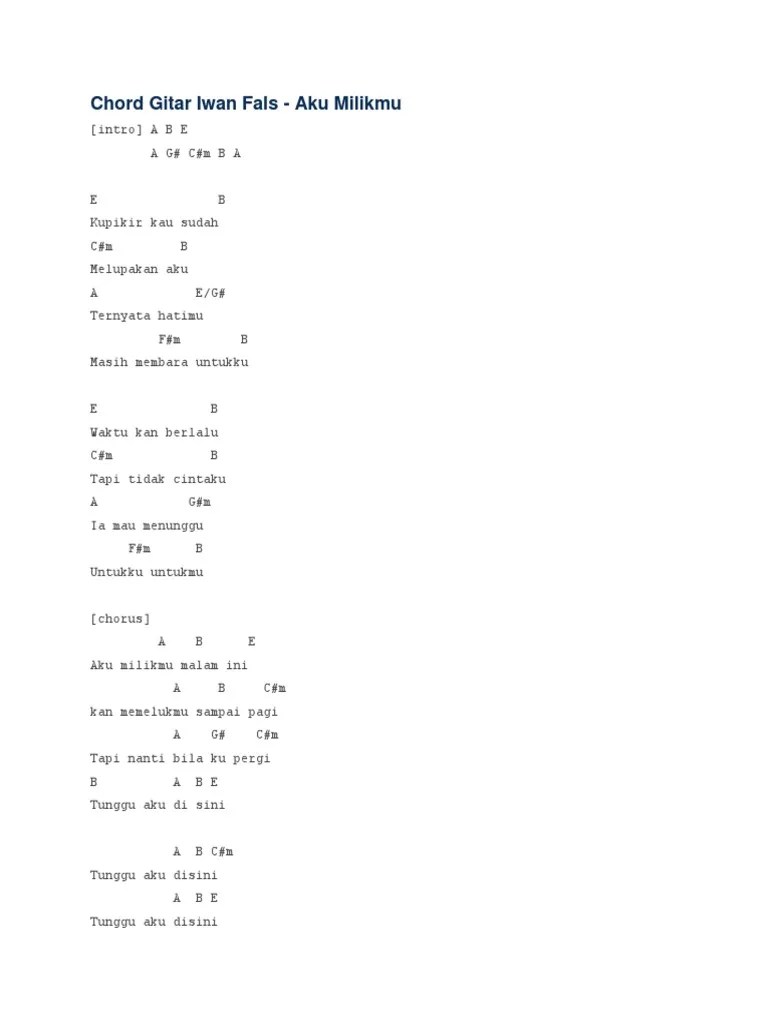 G a d (2x) d dmaj7 ku pikir kau sudah Lagu ini sangat memorial bagi masayarakat indonesia k. G f g c tunggu aku disini. G#m ia mau menunggu f#m b untukmu untukmu chorus a b e aku milikmu malam ini a b . intro a b e a g# c#m b a e b kupikir kau sudah c#m b melupakan aku. F g am kan memelukmu sampai pagi. (chorus) g a d aku milikmu malam ini g a bm kan memelukmu sampai pagi g a bm tapi nanti bila ku pergi em a d tunggu aku di.si.ni. Waktu 'kan berlalu tetapi tidak cintaku dia mau menunggu untukmu untukmu. F e am tapi nanti bila ku pergi. Capo di fret 2 (intro) f g am f g am c g/b ku pikir kau sudah am g melupakan aku f c/e ternyata hatimu dm g masih membara. Ayocirebon.com lagu berjudul aku milikmu (malam ini) merupakan karya pongki barata yang kembali hits di media sosial, aplikasi musik joox, . Kunci gitar dimainkan dari c. C g am g f e.